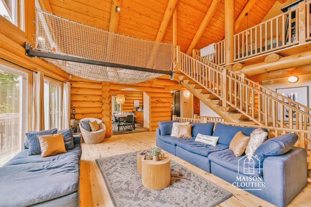 À l’intérieur, la lumière naturelle met en valeur les textures chaleureuses du bois rond, créant une ambiance douce, feutrée et profondément réconfortante. Le chalet compte 5 chambres, 7 lits et 3 salles de bain complètes, pensées pour accueillir familles et groupes en quête d’espace, de confort et d’harmonie.
