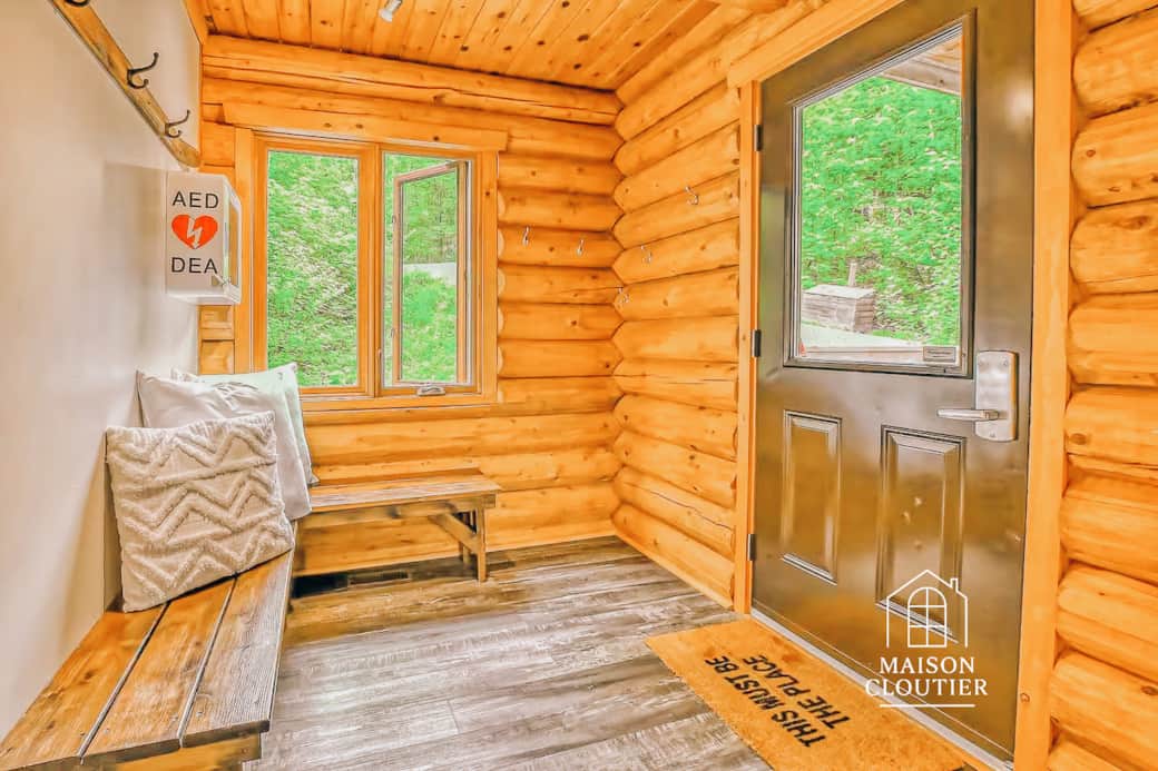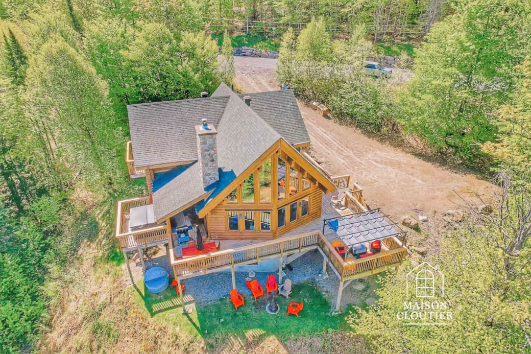 À l’intérieur, la lumière naturelle met en valeur les textures chaudes du bois rond. Le salon cathédrale avec son foyer de pierre, la salle à manger vitrée et la cuisine ouverte créent une ambiance rassembleuse, chaleureuse et profondément réconfortante.